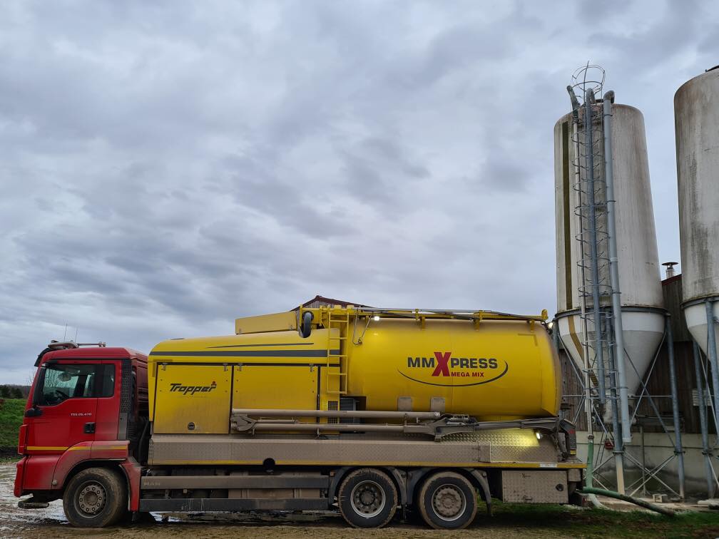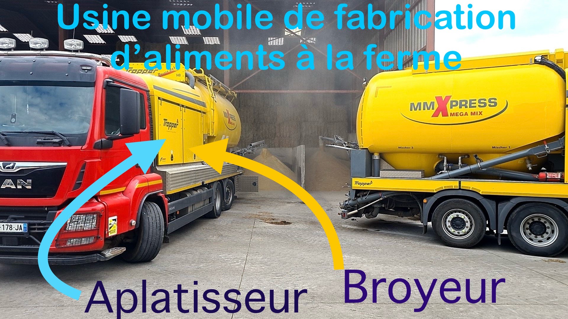 Nous disposons d’un camion équipé de sa propre usine mobile de fabrication d’aliment à la ferme. Il permet soit d’aplatir, de broyer, de mélanger les céréales et d’incorporer des minéraux pour fabriquer un aliment fermier différent chez chaque agriculteur.